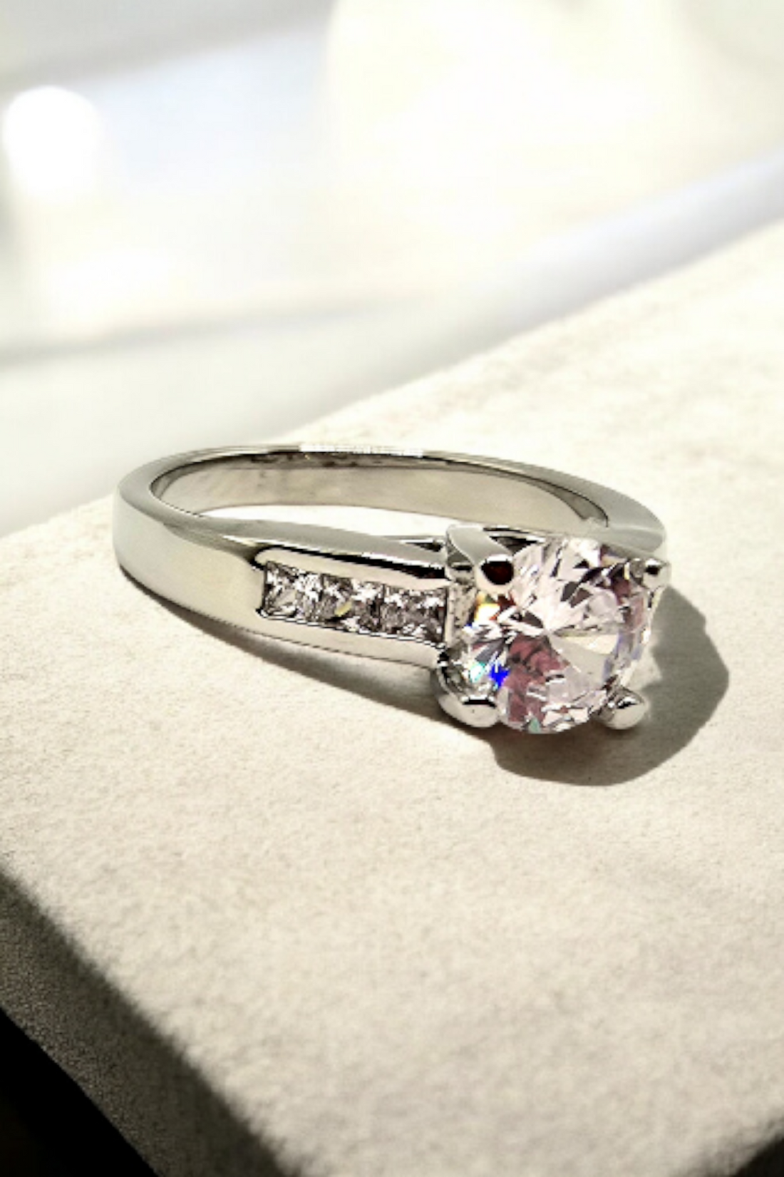 This ring features a solitaire design with channel-set side stones. The central stone is held...