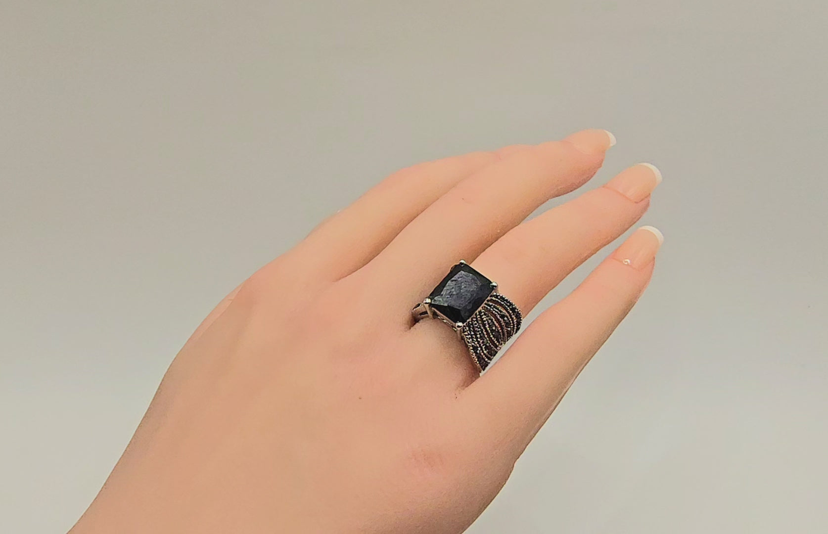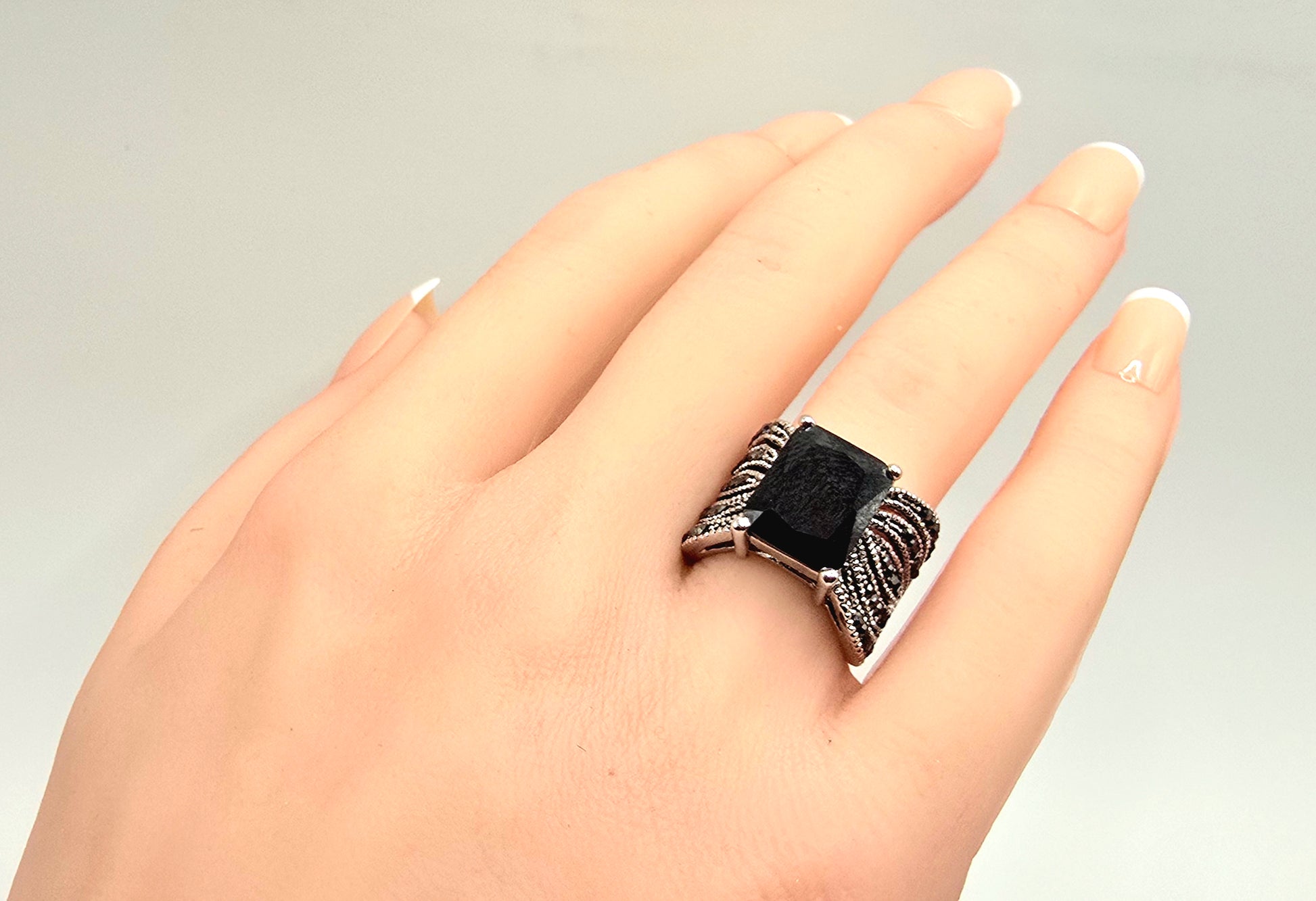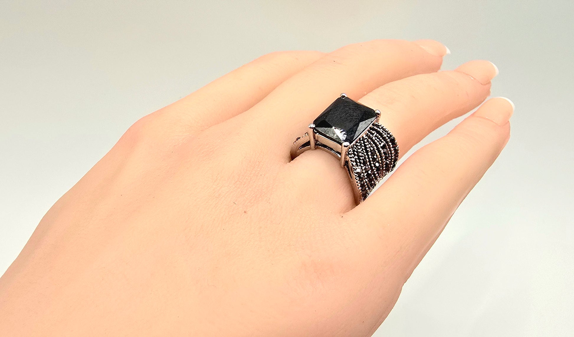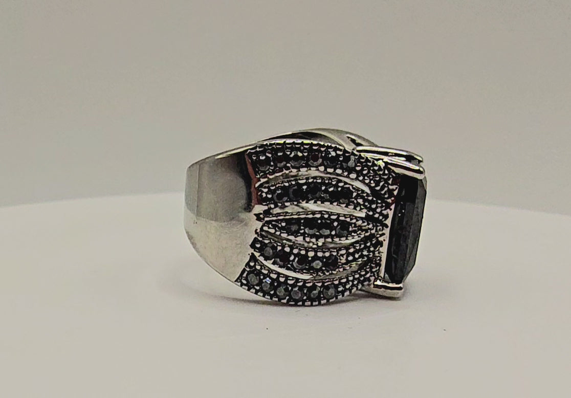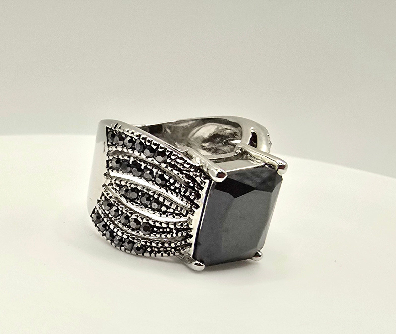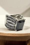 Command attention with a ring that speaks through form, contrast, and presence. This bold statement ring features a striking square-cut black stone, elevated in a clean four-prong architectural setting that exudes modern confidence. The deep, mirror-like surface of the stone captures light subtly, projecting quiet power rather than excess.