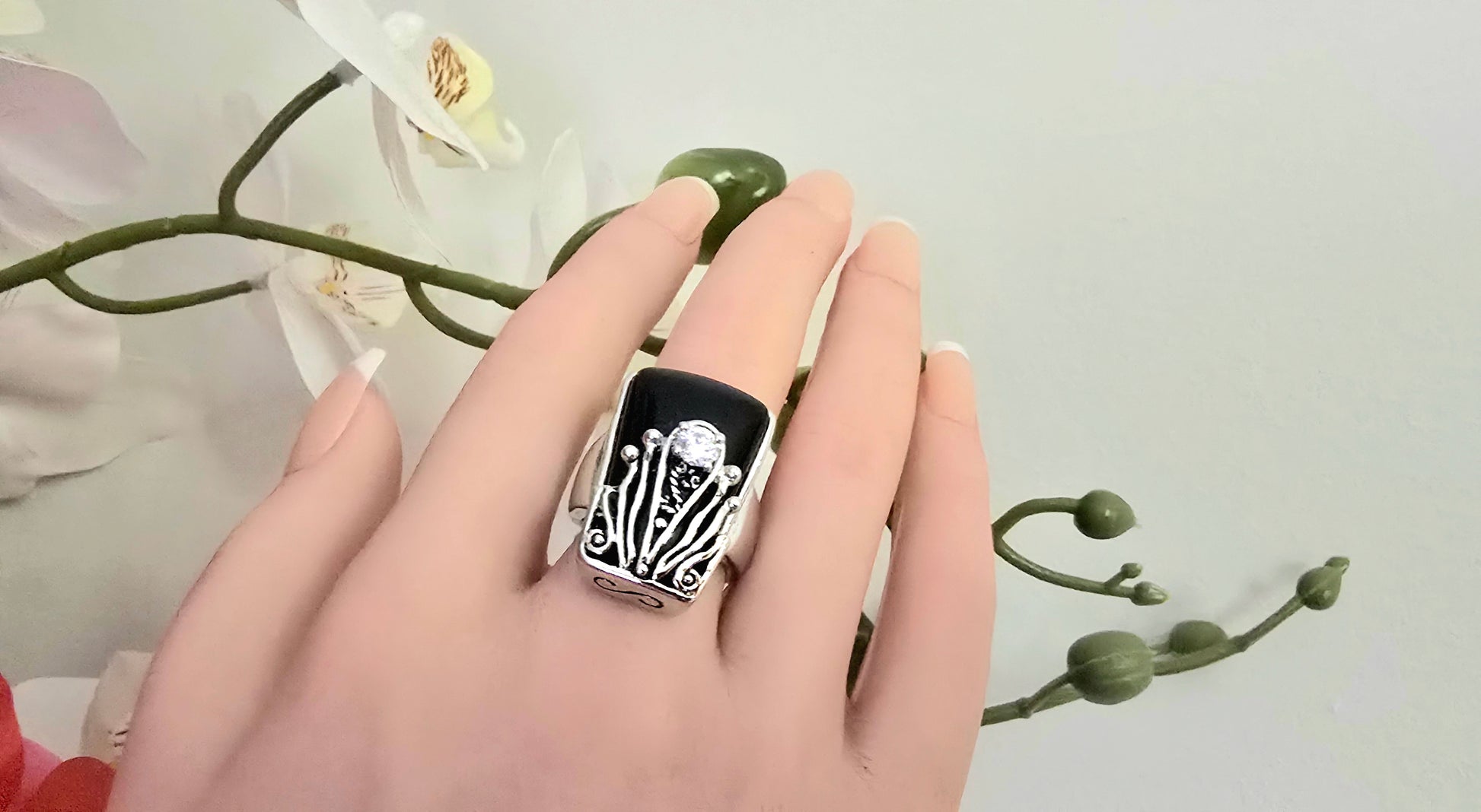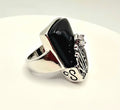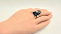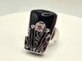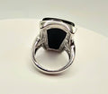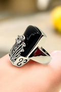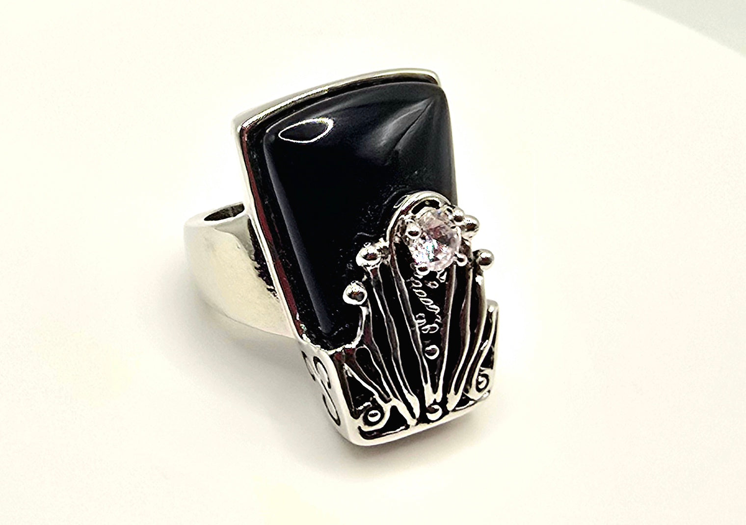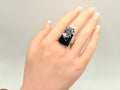 Design Aesthetic: The ring features a large, tapered black onyx-style cabochon set in a bold, rectangular "shield" silhouette. The base is adorned with intricate silver-toned filigree work that rises up the face of the stone, culminating in a single, sparkling clear crystal accent held in a floral-like prong setting. It captures the same dark, romantic energy found in luxury boutiques that specialize in "modern heirloom" statement pieces.