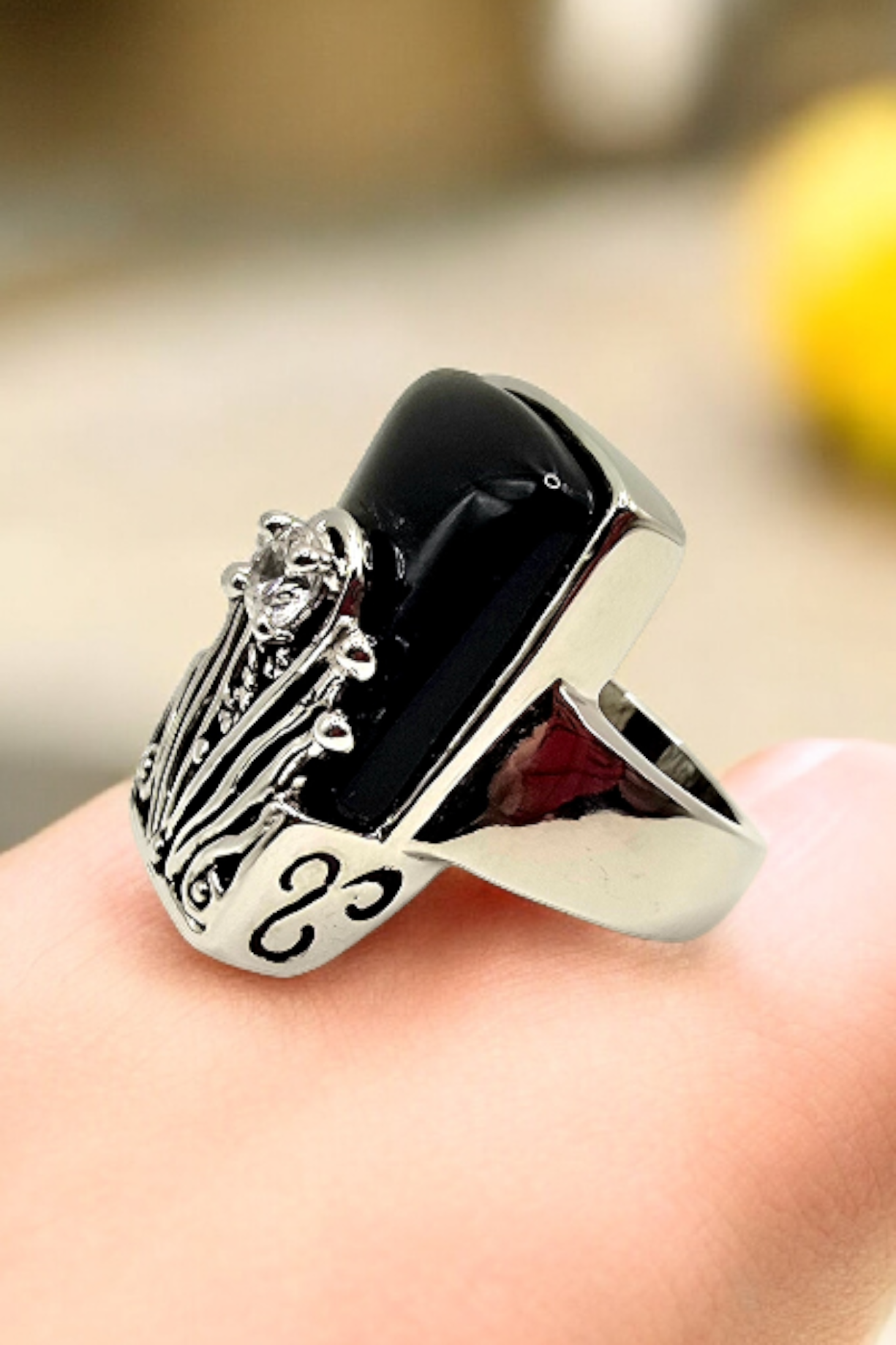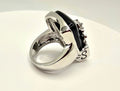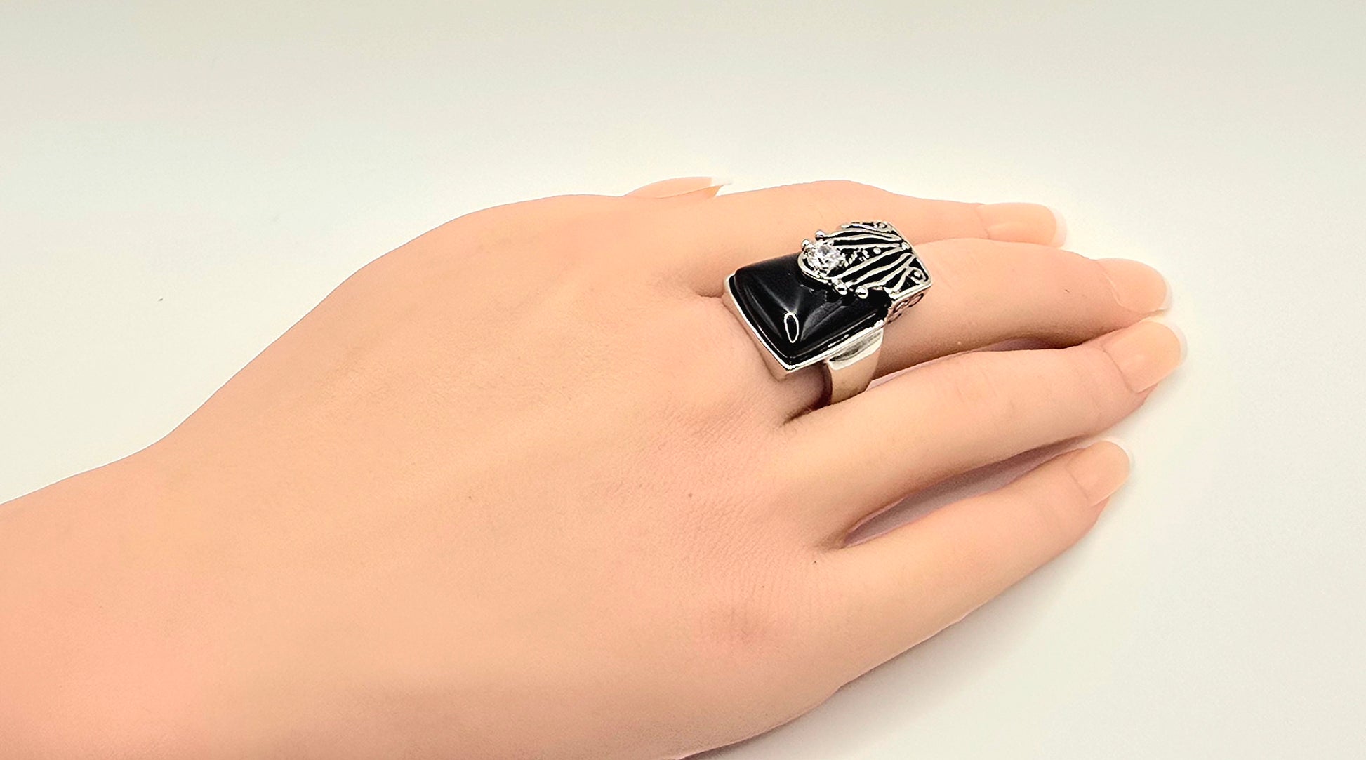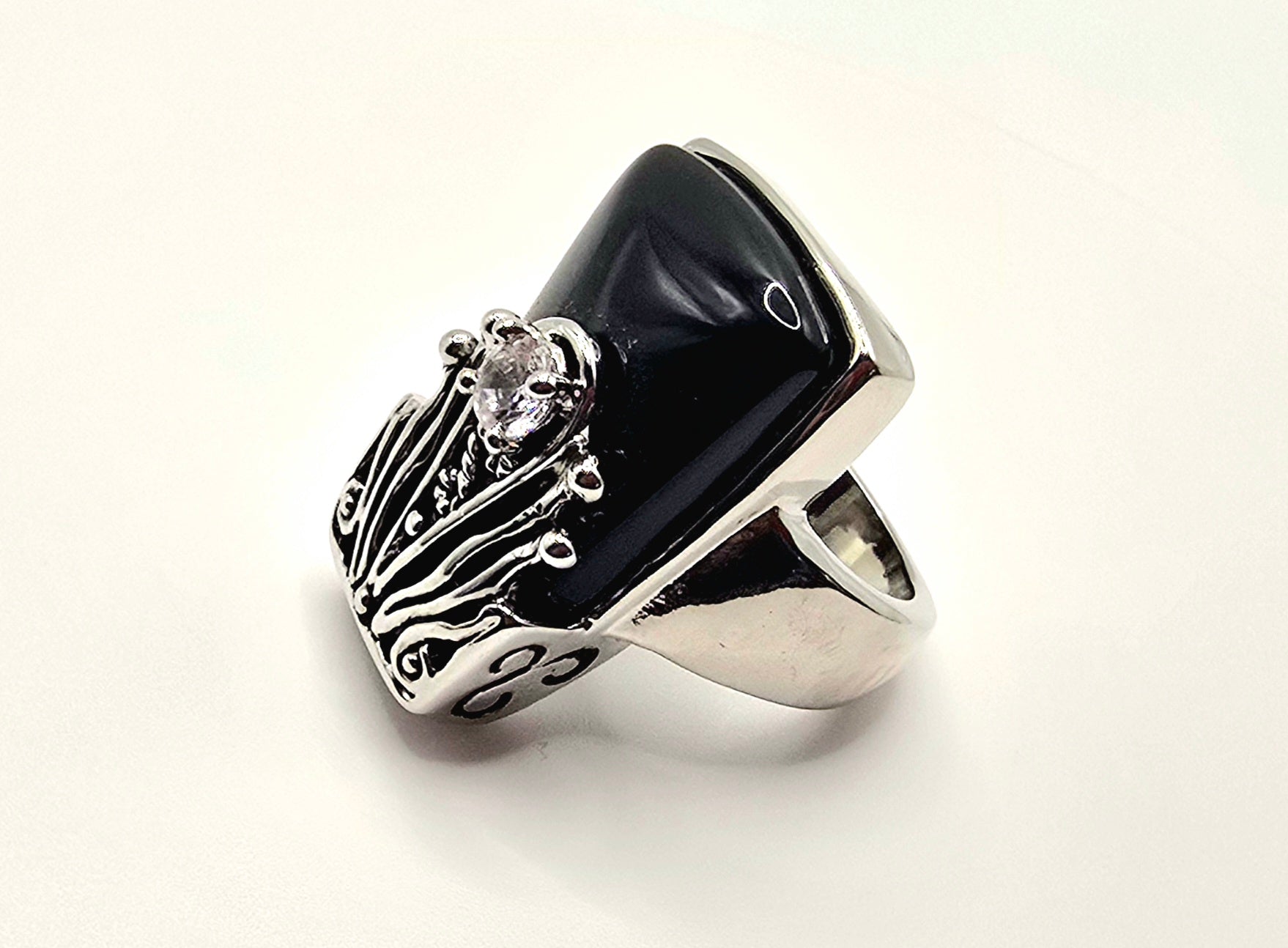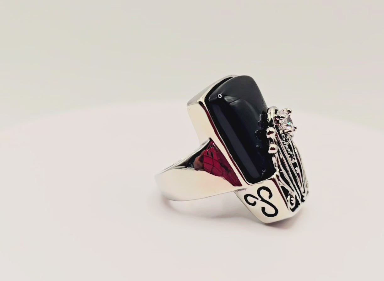 Timeless Contrast: The stark juxtaposition of the deep, midnight-black stone against the bright silver-toned metal and brilliant crystal accent makes this ring a perfect match for everything from formal gala attire to your favorite leather jacket.