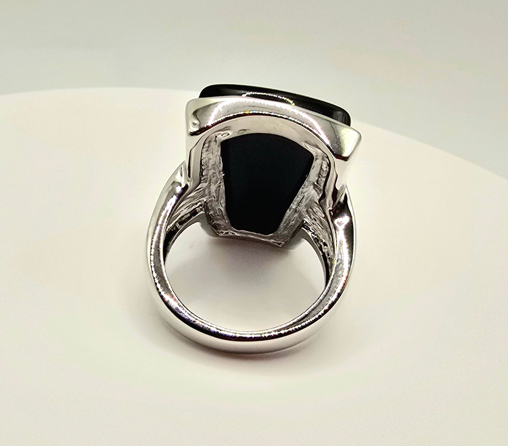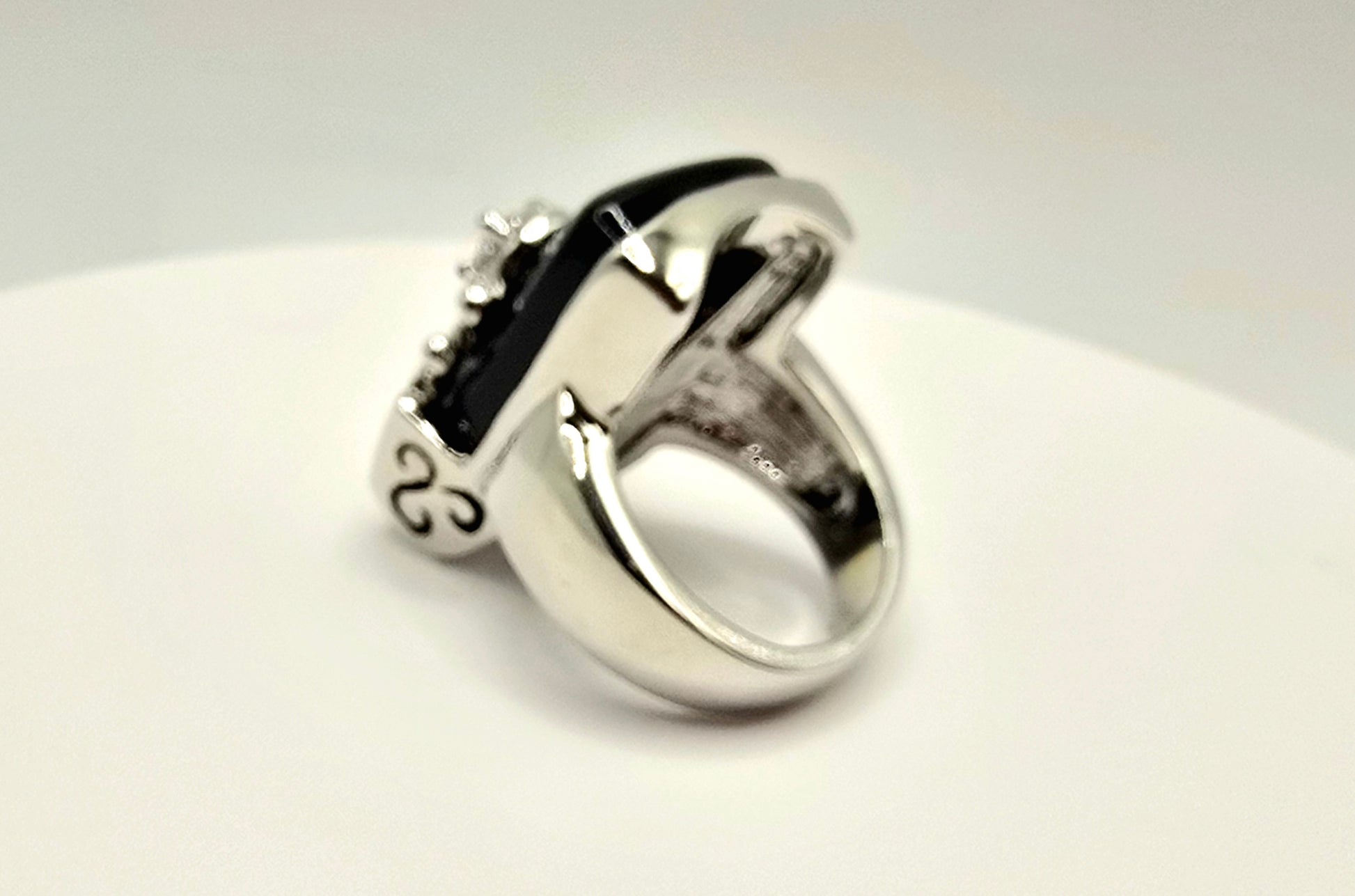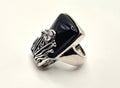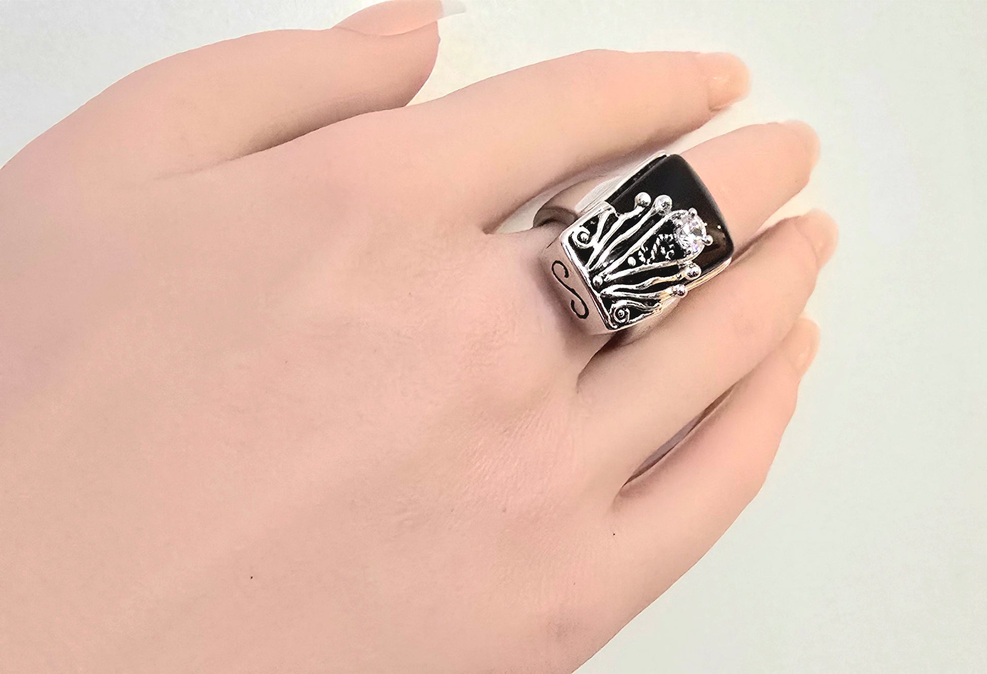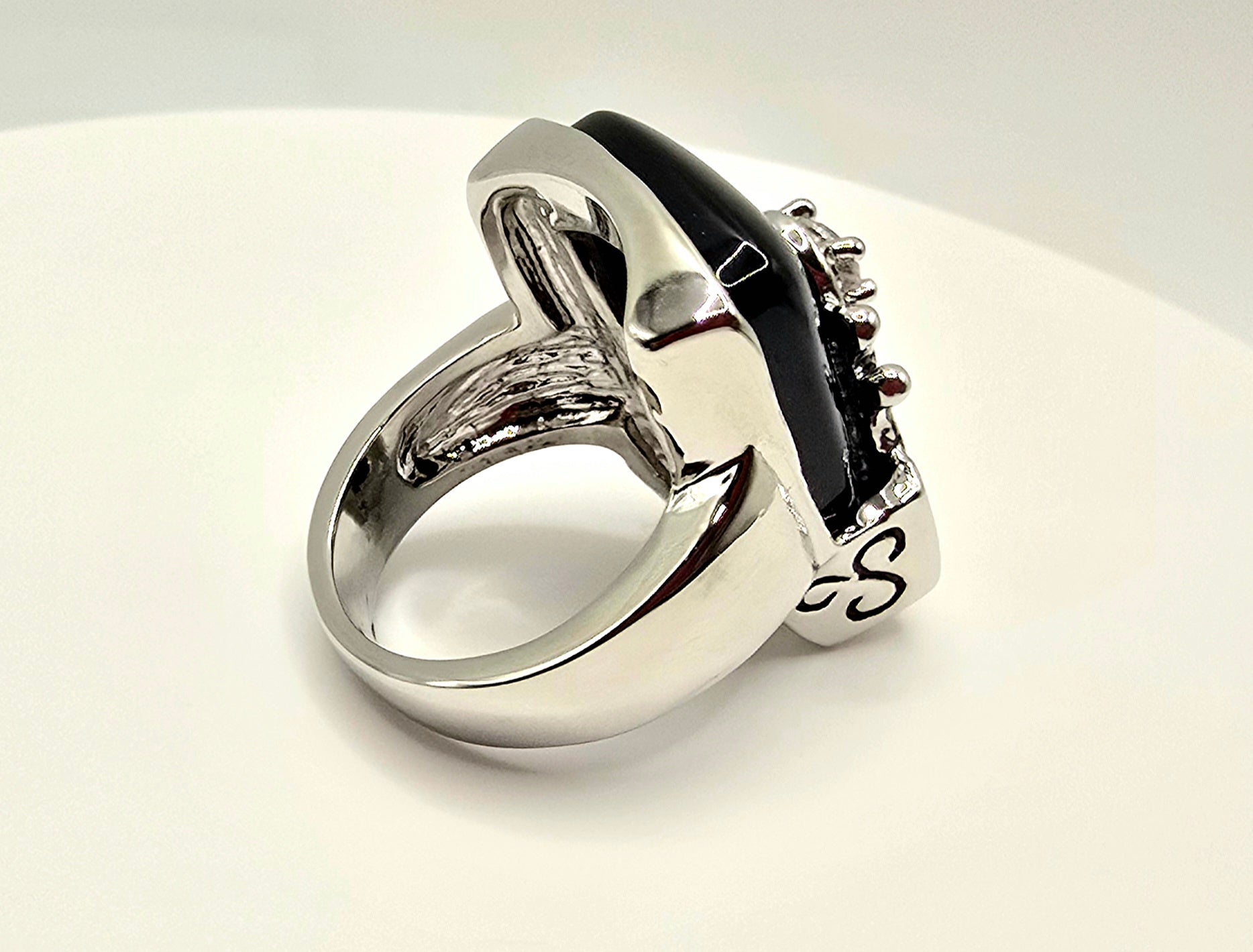 Timeless Contrast: The stark juxtaposition of the deep, midnight-black stone against the bright silver-toned metal and brilliant crystal accent makes this ring a perfect match for everything from formal gala attire to your favorite leather jacket.