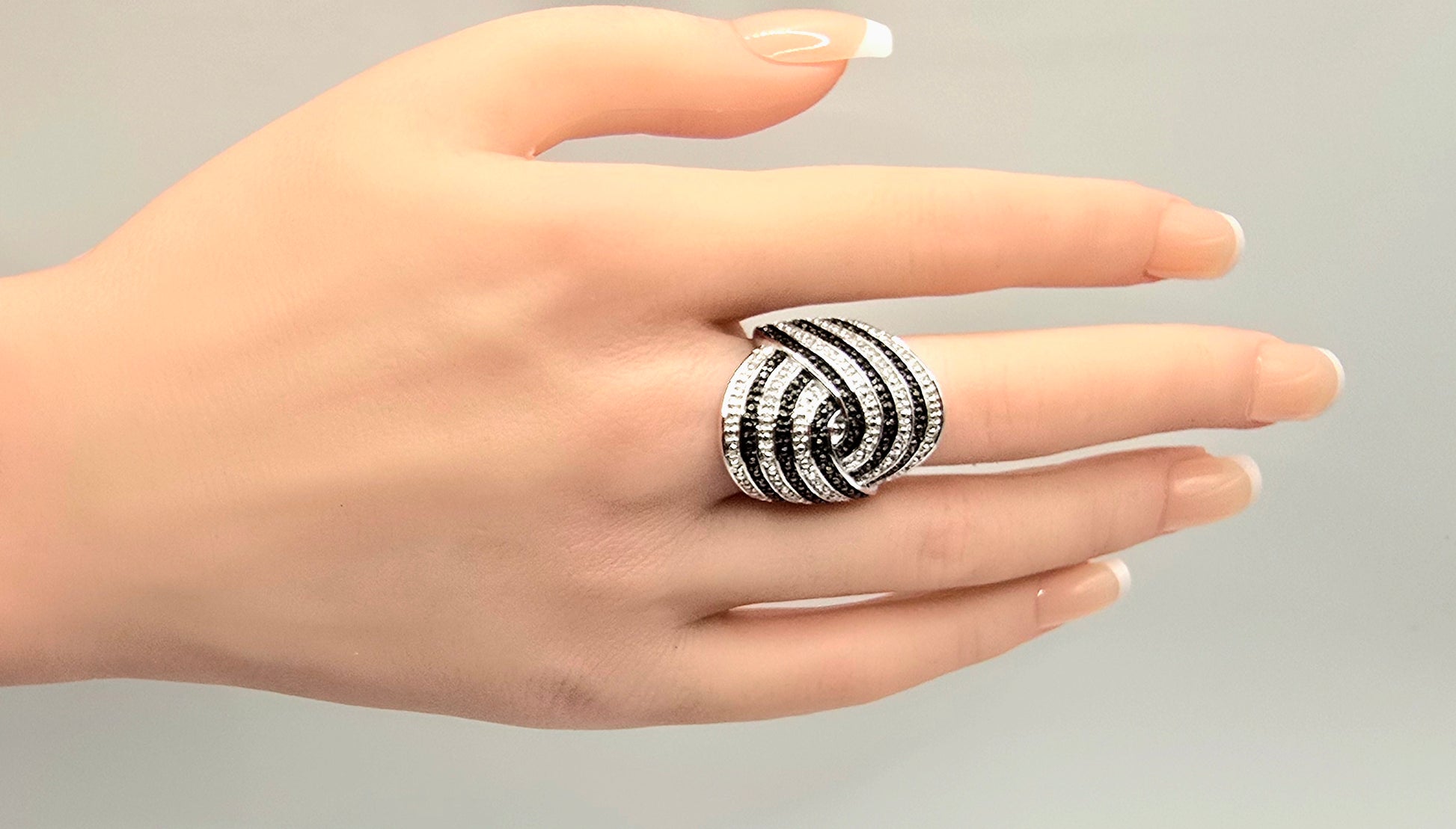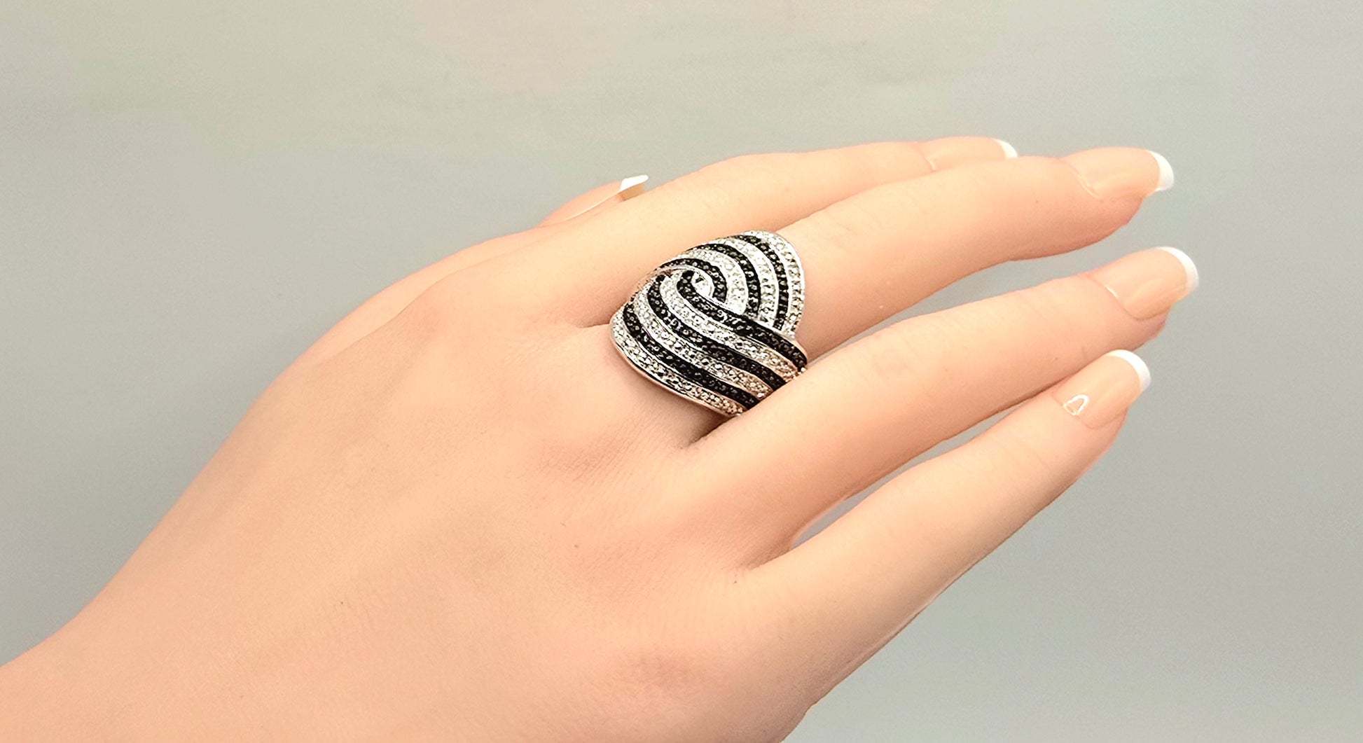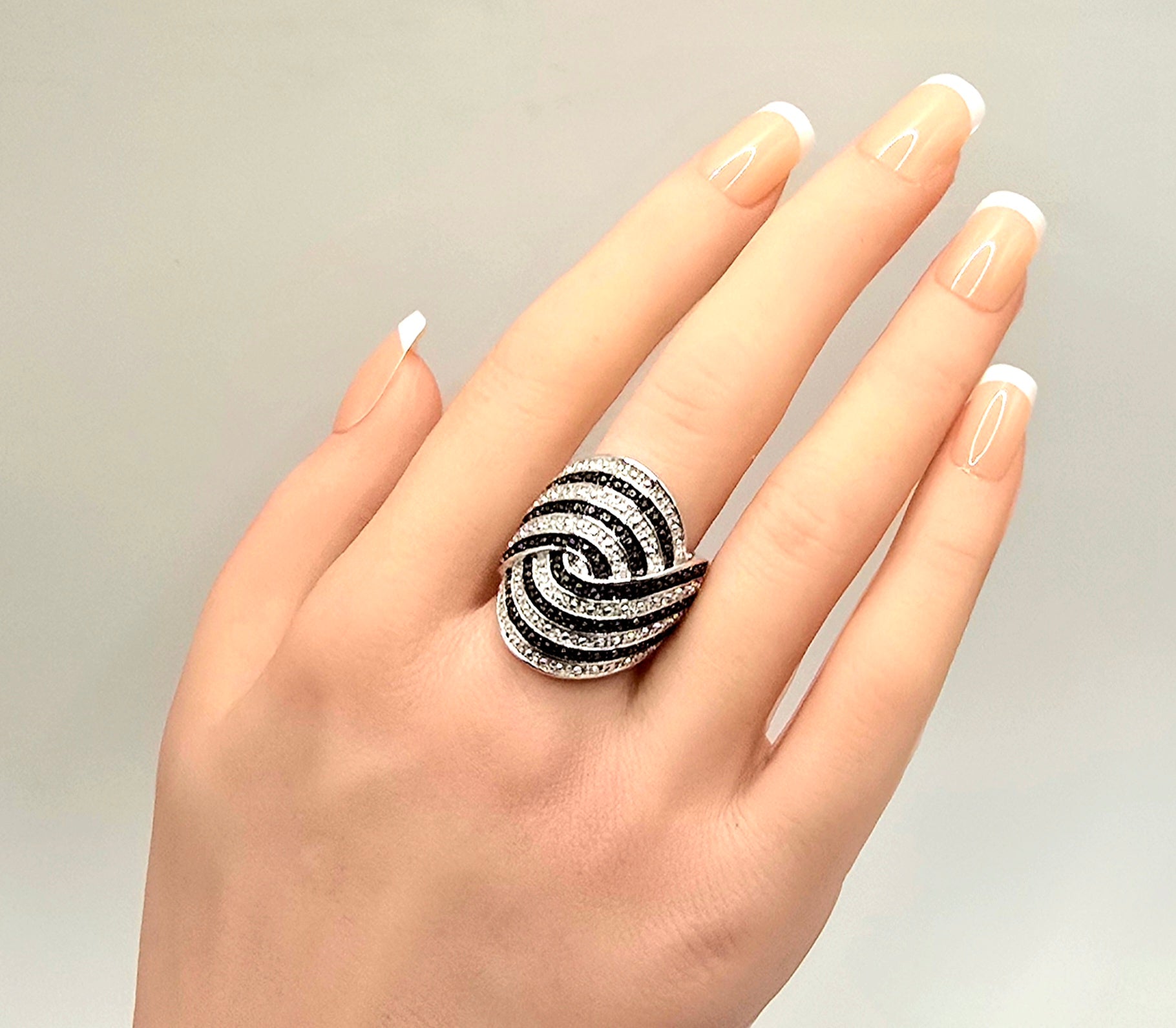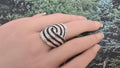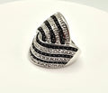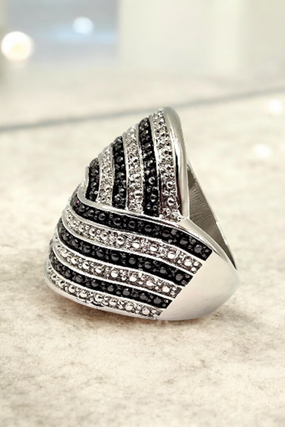This unique piece is a Monochromatic-Stripe Dome Ring, featuring a bold, sculptural design that merges high-fashion geometry with nature-inspired patterns. The ring is designed as a high-profile "dome" or "shield" ring, meticulously set with alternating rows of black and white pavé crystals. The sweeping, curved lines create a rhythmic "zebra stripe" effect that wraps around the contours of the piece, giving it a sense of fluid motion.