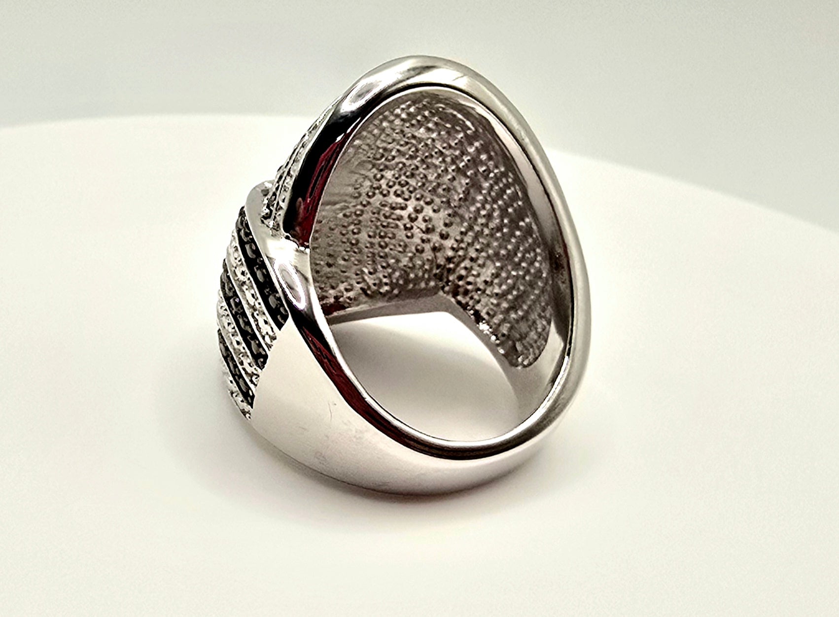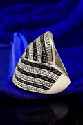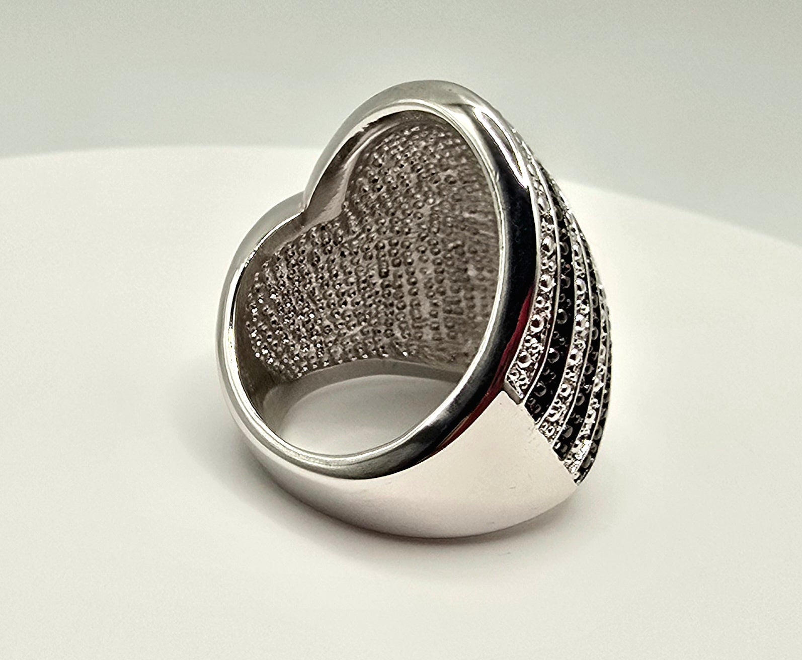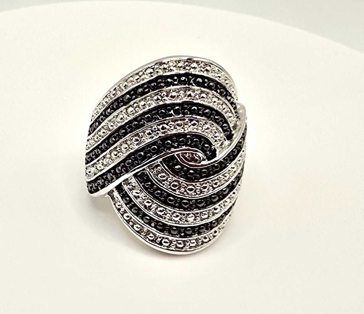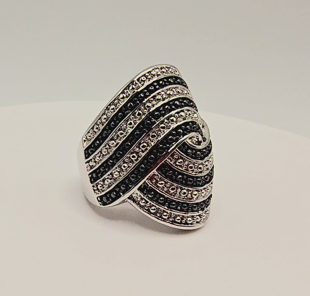 This unique piece is a Monochromatic-Stripe Dome Ring, featuring a bold, sculptural design that merges high-fashion geometry with nature-inspired patterns. The ring is designed as a high-profile "dome" or "shield" ring, meticulously set with alternating rows of black and white pavé crystals. The sweeping, curved lines create a rhythmic "zebra stripe" effect that wraps around the contours of the piece, giving it a sense of fluid motion.