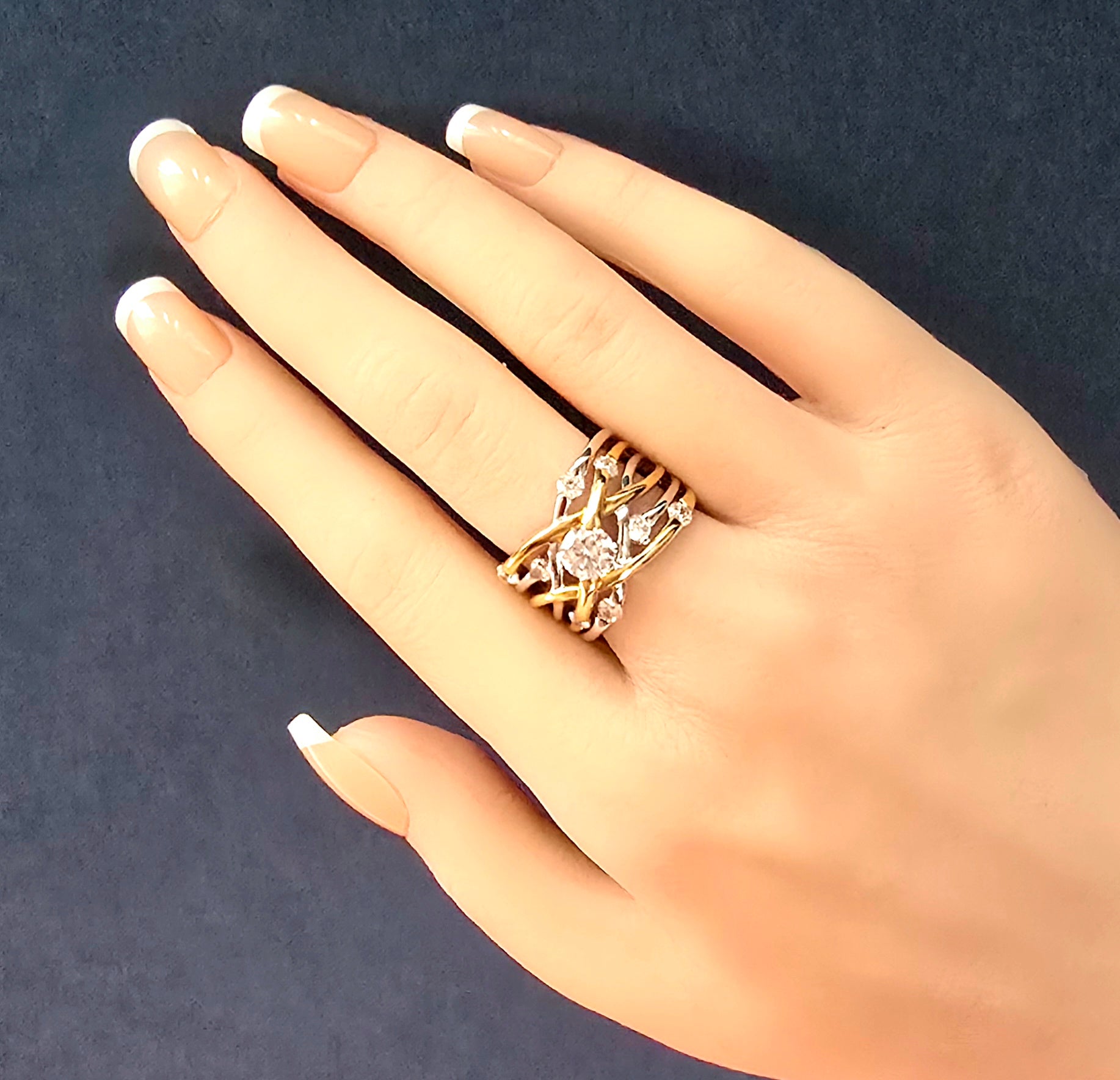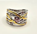 This stunning piece is a Two-Tone Interwoven Crossover Statement Ring, a design that represents the beautiful complexity of paths crossing and lives joining together. The ring features a wide "caged" silhouette created by multiple interwoven bands in both silver and yellow-gold tones. This layered look gives the piece a bold, three-dimensional presence on the hand, anchored by a prominent round-cut central stone and accented by smaller brilliant-cut stones scattered throughout the weave.
